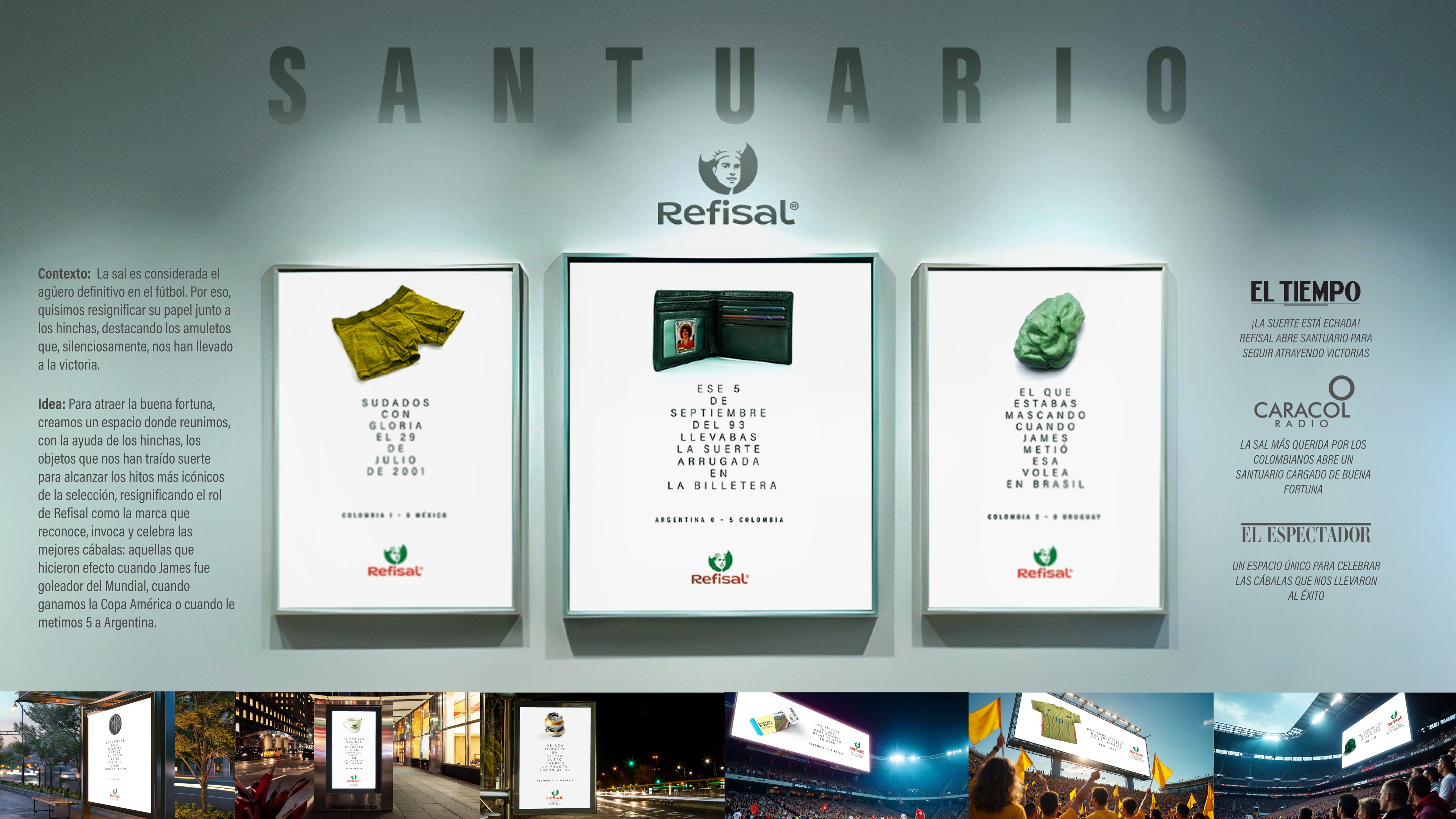 | descripción de la propuesta: | Para atraer la buena fortuna, creamos un espacio donde reunimos, con la ayuda de los hinchas, los objetos que nos han traído suerte para alcanzar los hitos más icónicos de la selección, resignificando el rol de Refisal como la marca que reconoce, invoca y celebra las mejores cábalas: aquellas que hicieron efecto cuando James fue goleador del Mundial, cuando ganamos la Copa América o cuando le metimos 5 a Argentina. |