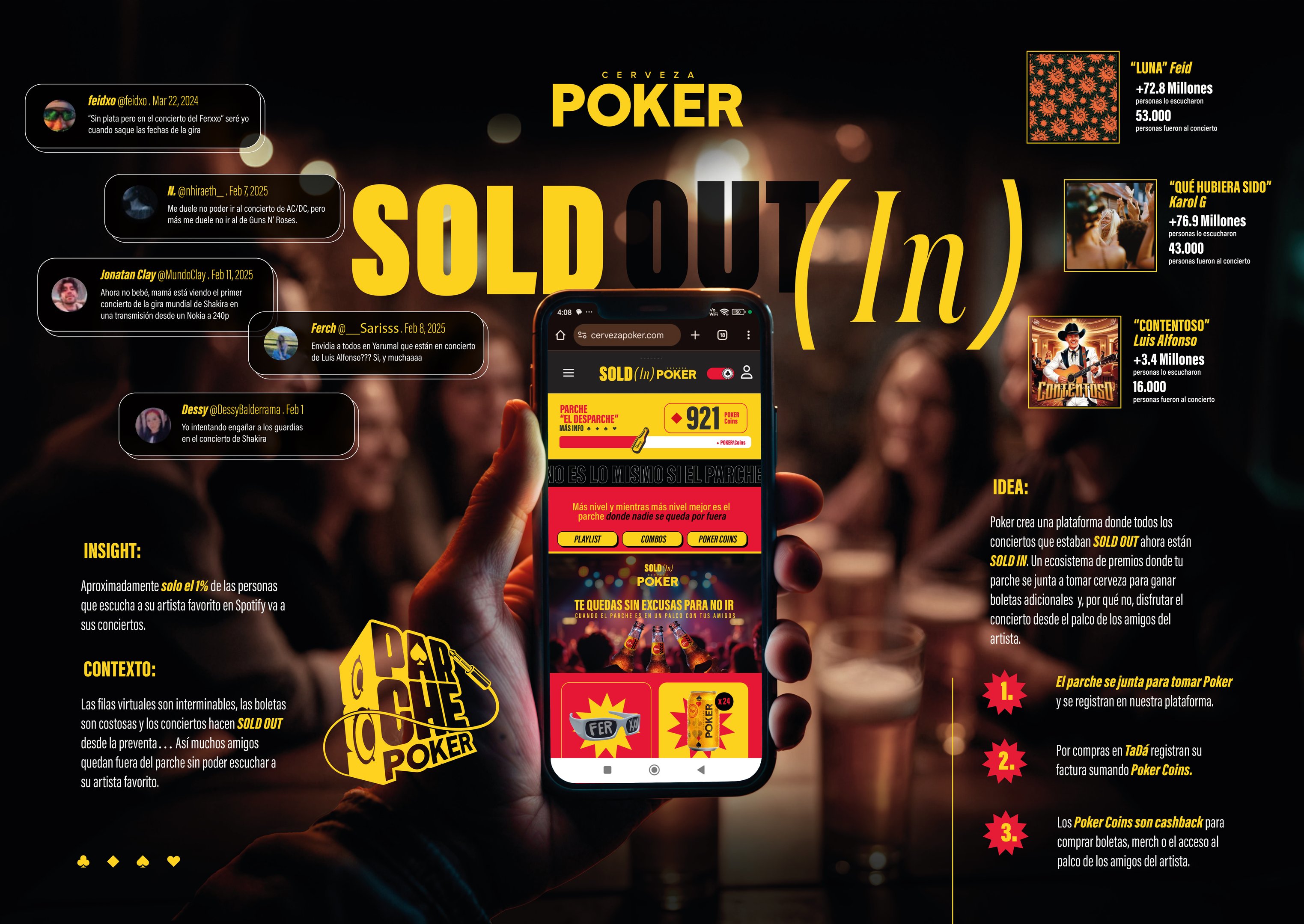 | descripción de la propuesta: | Poker crea una plataforma donde todos los conciertos que estaban SOLD OUT ahora están SOLD IN. Un ecosistema de premios donde tu parche se junta a tomar cerveza para ganar boletas adicionales y, por qué no, disfrutar el concierto desde el palco de los amigos del artista. |